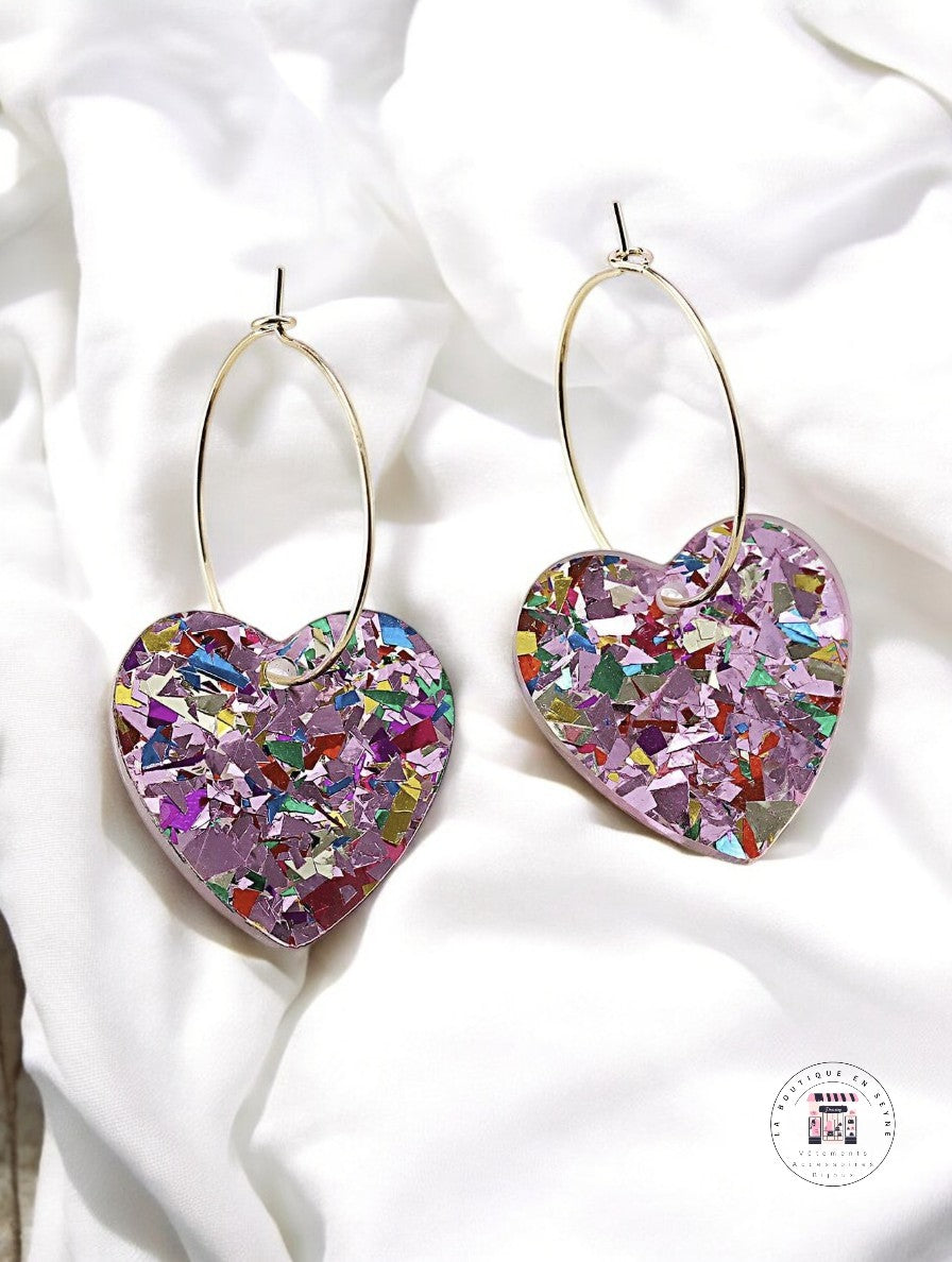 Boucles d’oreilles créoles cœur dorées & rose clair, fuchsia ou bleu