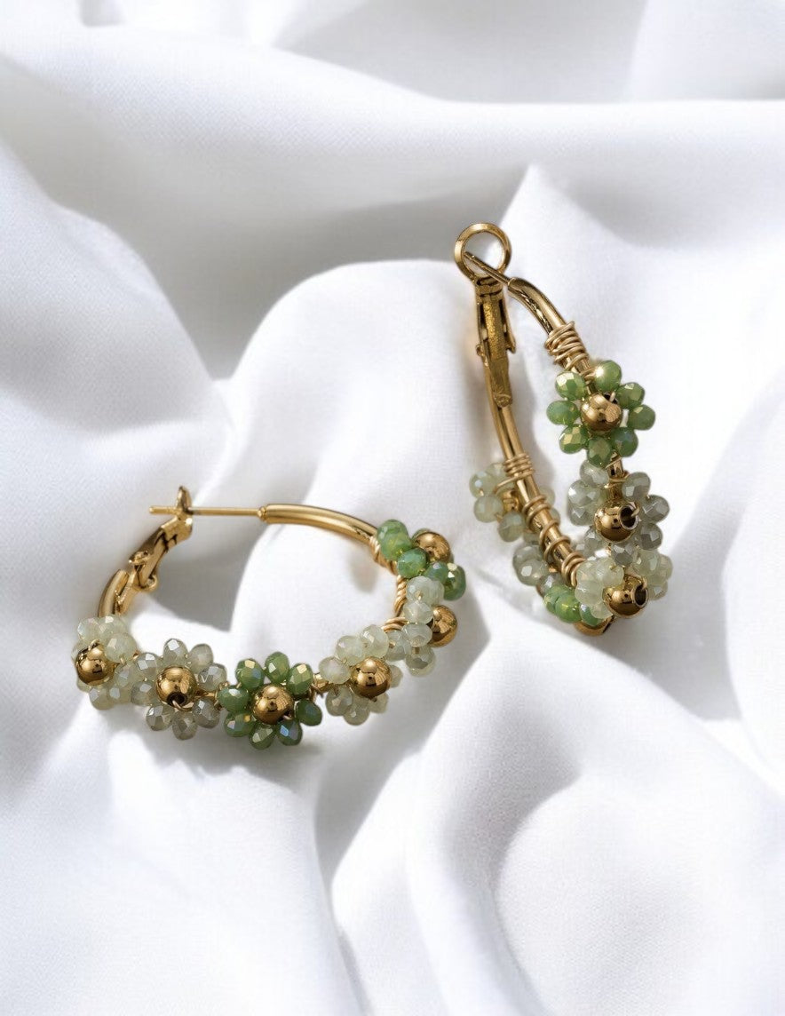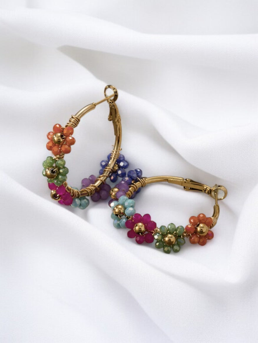 Boucles d’oreilles créoles dorées & fleurs en perles vert ou multicolores
