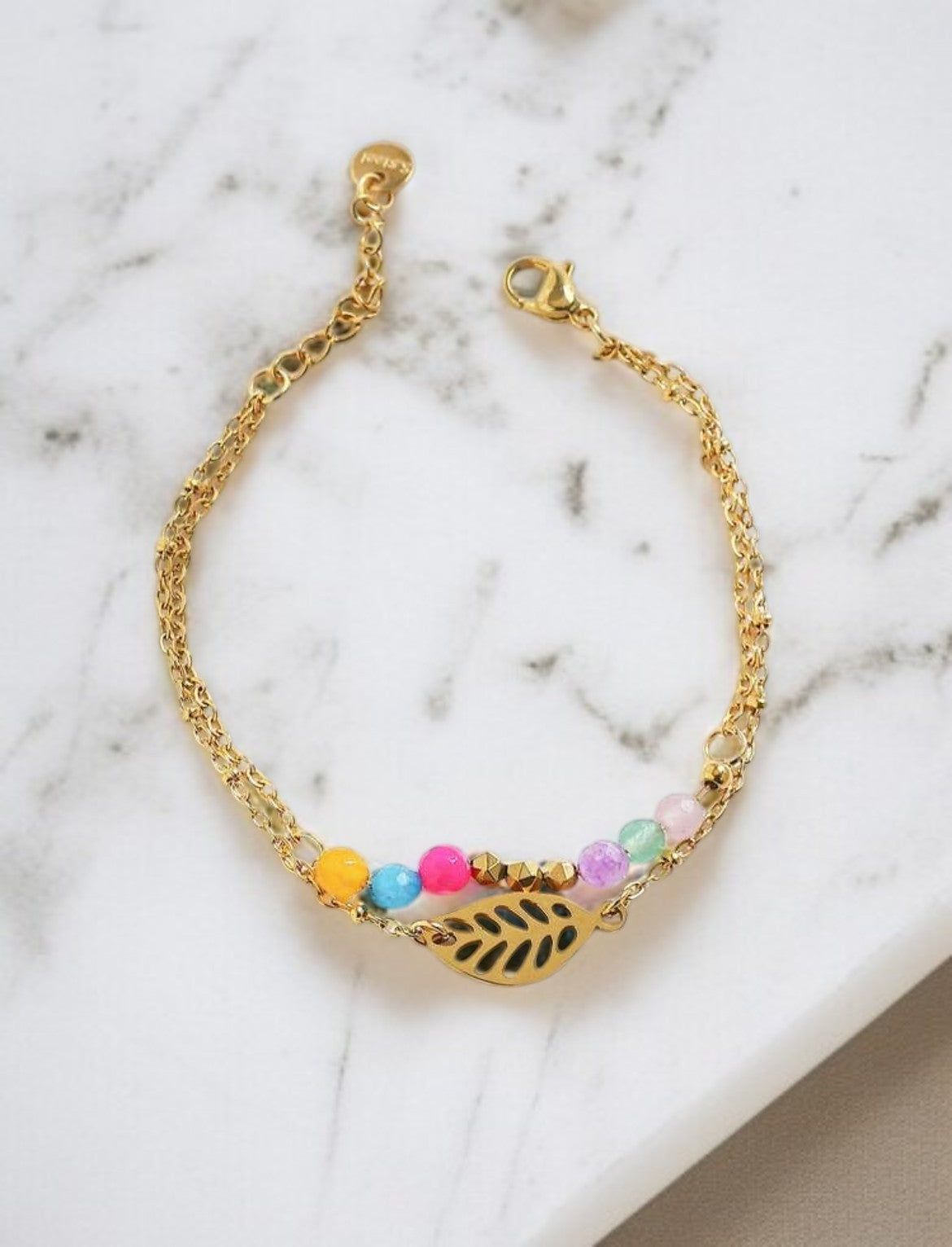 Bracelet double chaîne doré perles multicolores et feuille dorée