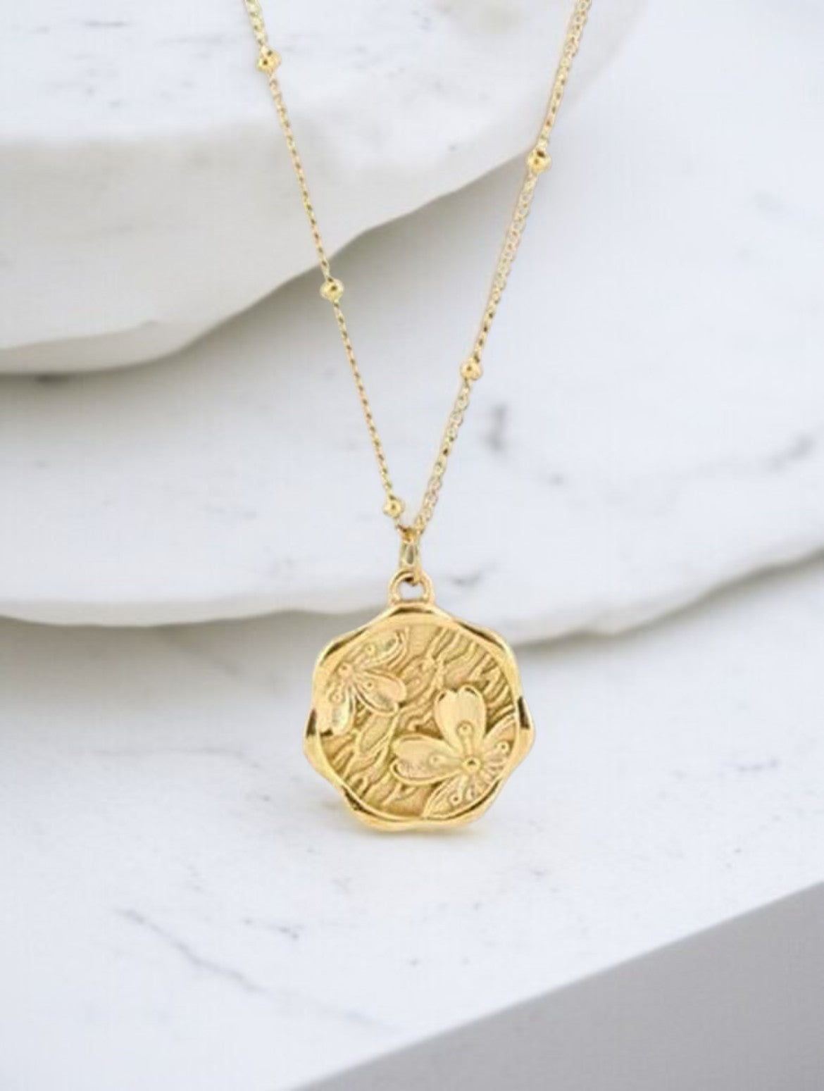 Collier doré avec pendentif pièce fleurs avec chaîne perles