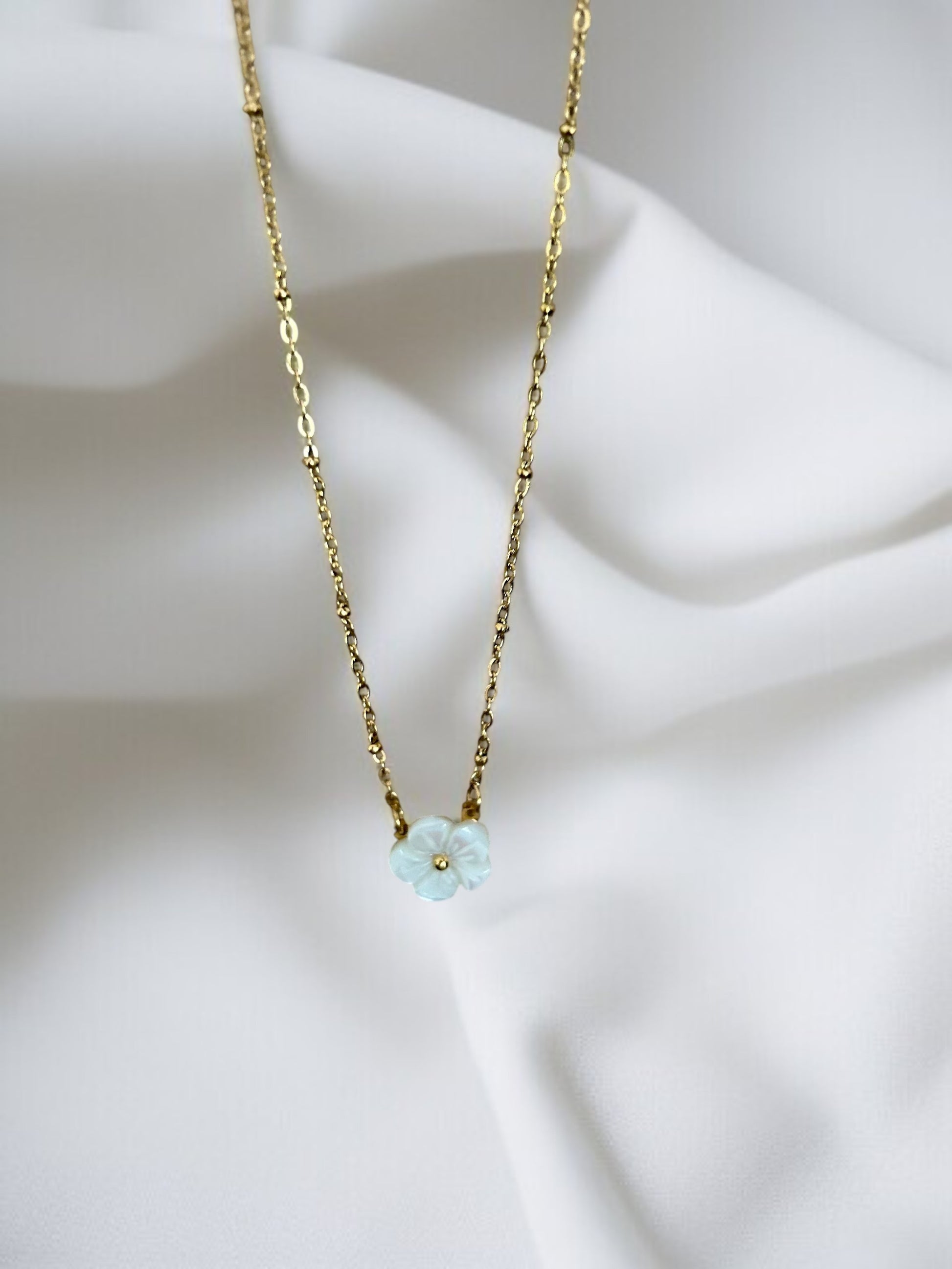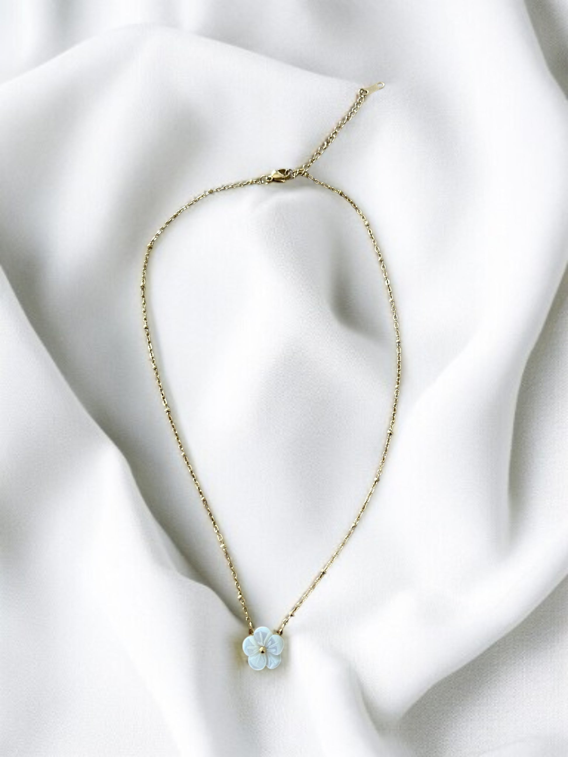 Collier doré et fleurs blanches et petites perles