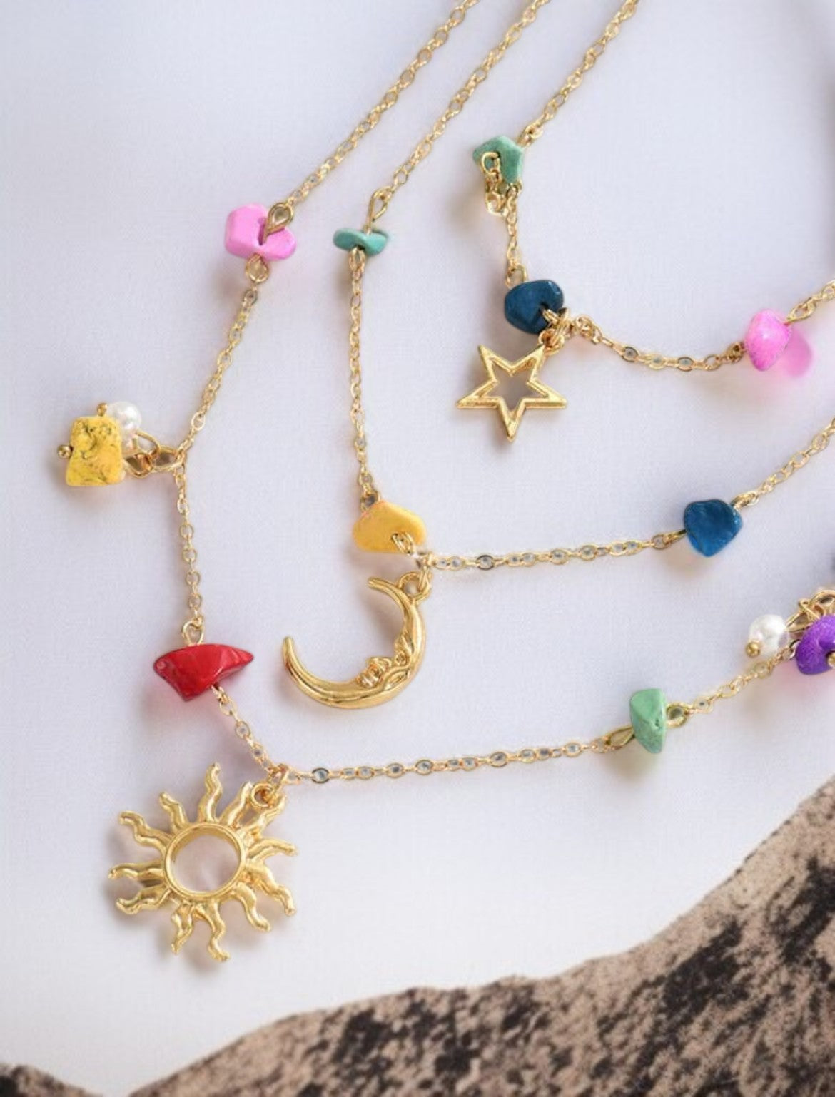 Collier pendentif bohème doré 3 rangs perles multicolores étoile, soleil et lune