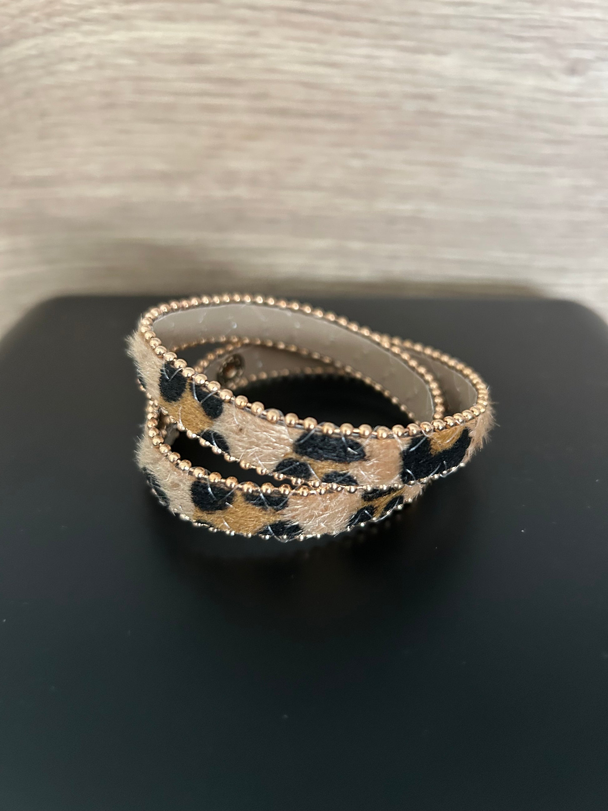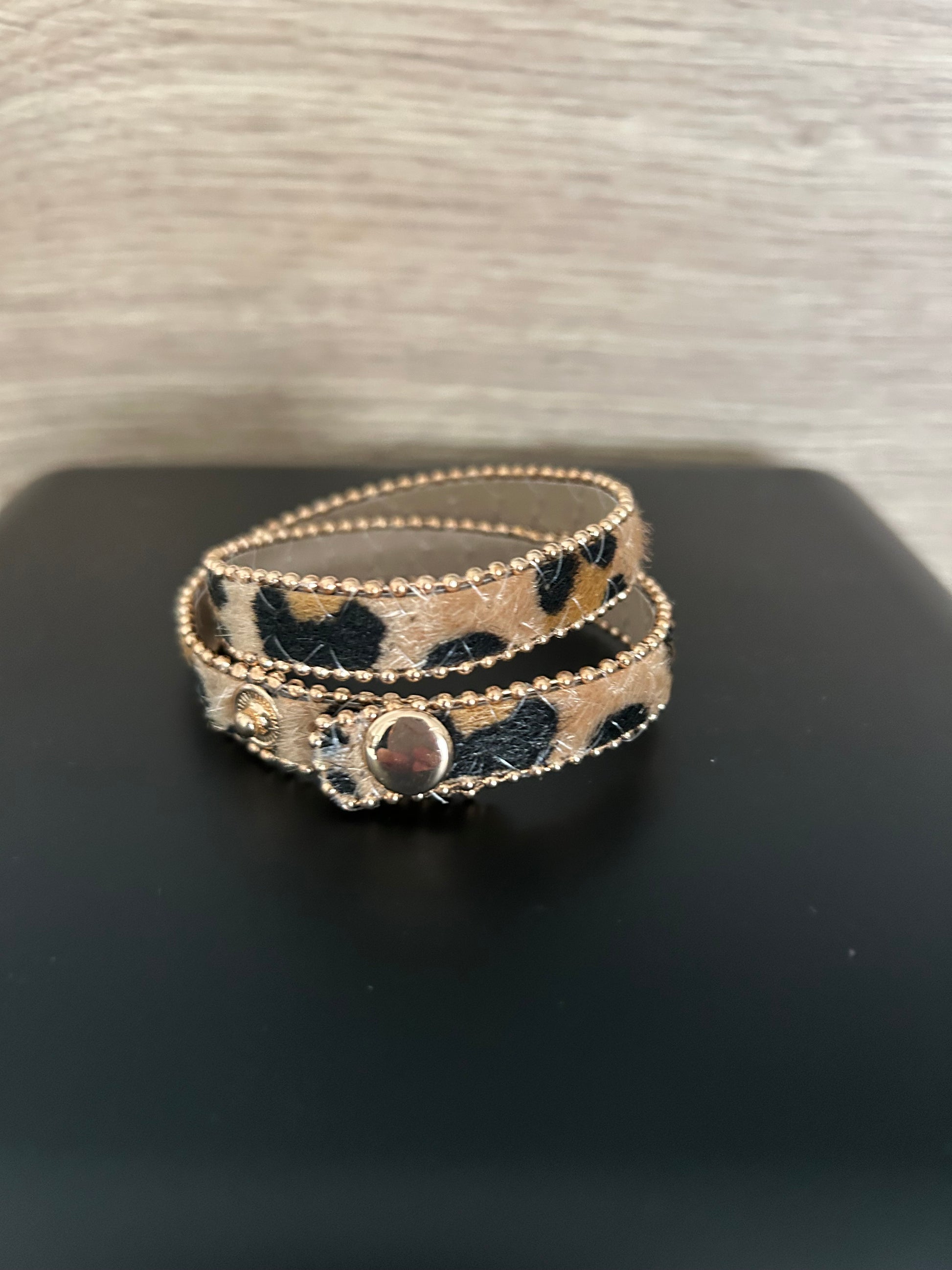 Bracelet double tour avec bouton pression / léopard marron effet peau et perles dorées à l’extérieur