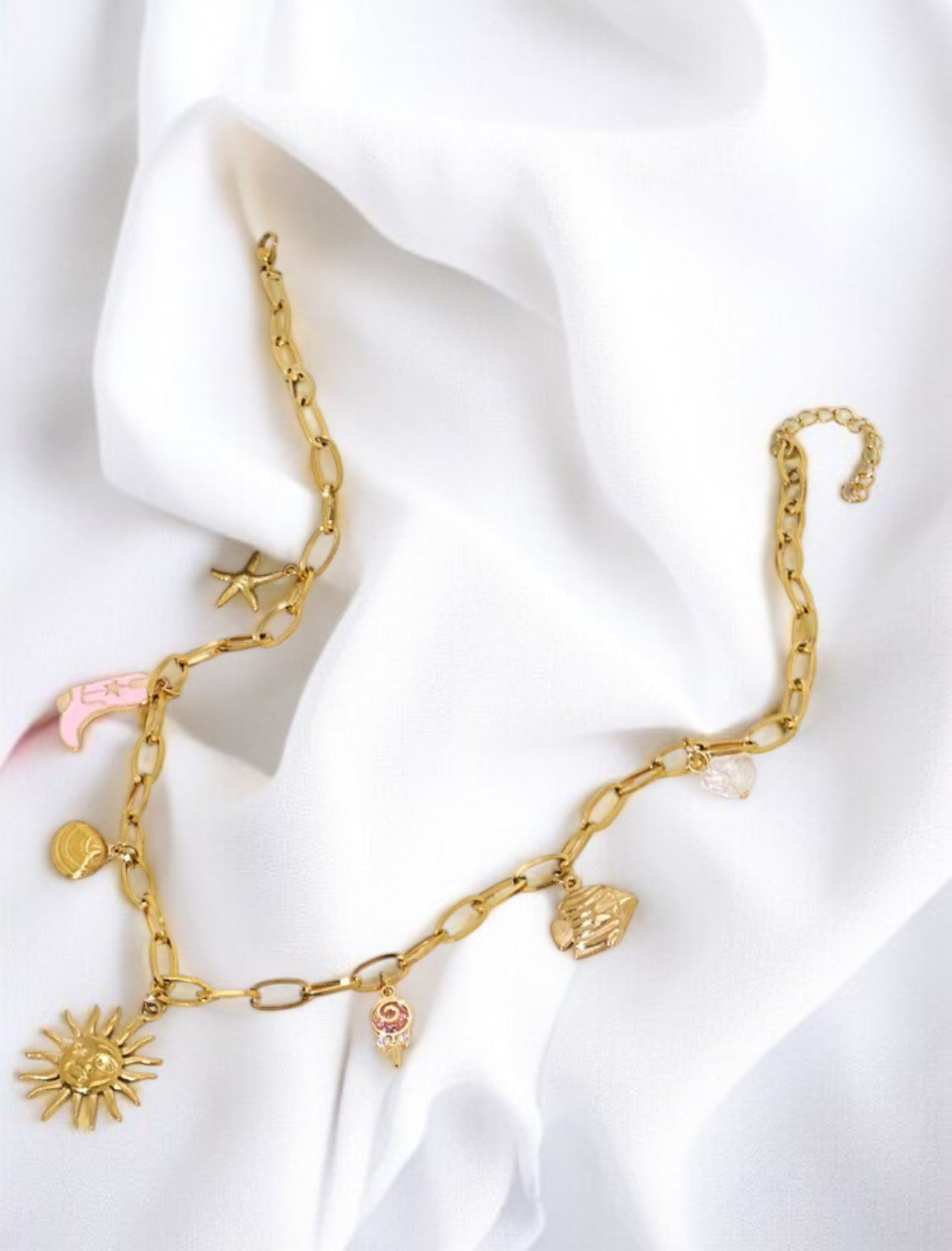 Collier pendentif doré plage été summer coquillage Avec charms / breloques : étoile de mer / botte santiag rose / coquillage/ soleil / poisson / cœur / sucette