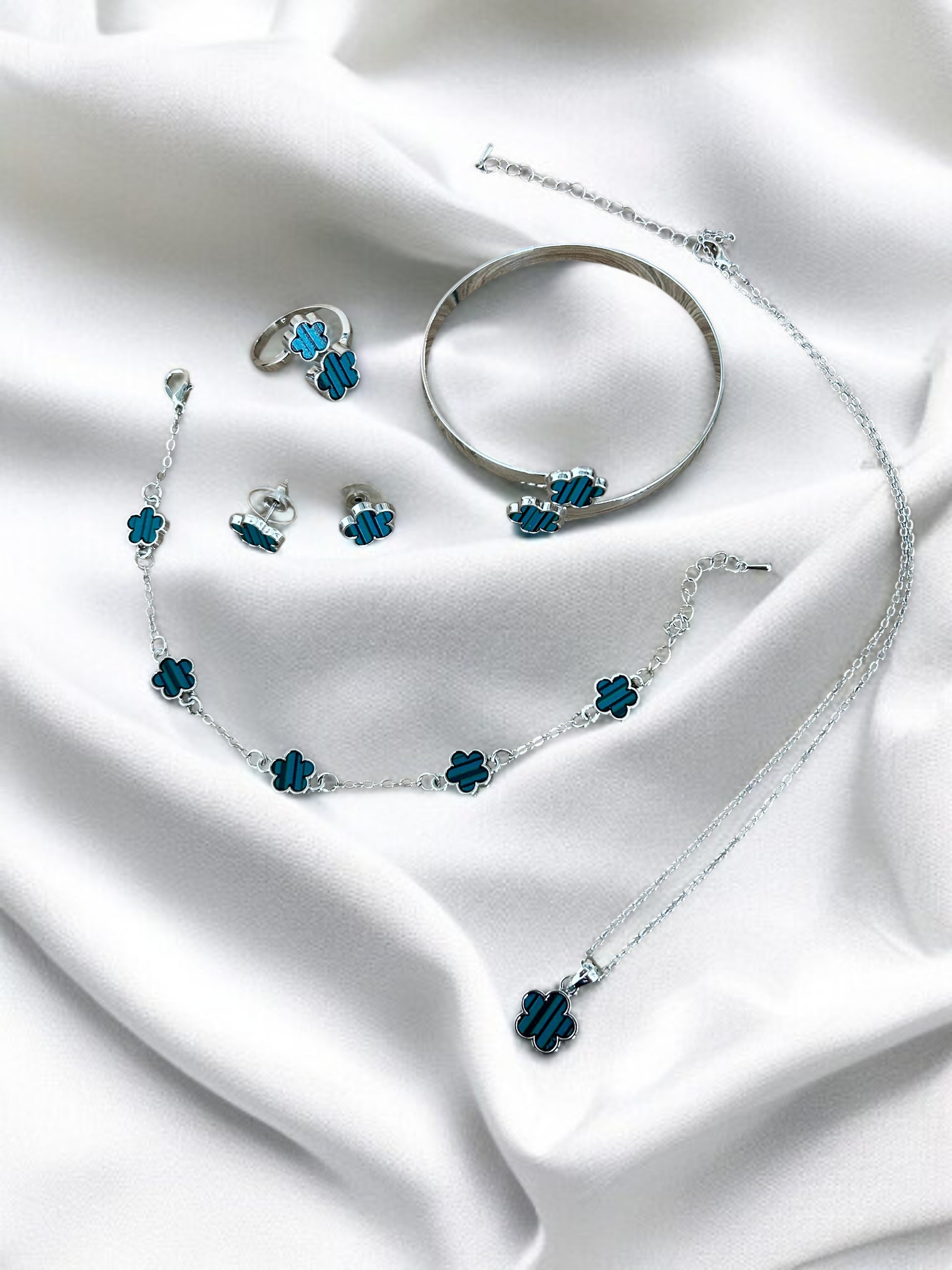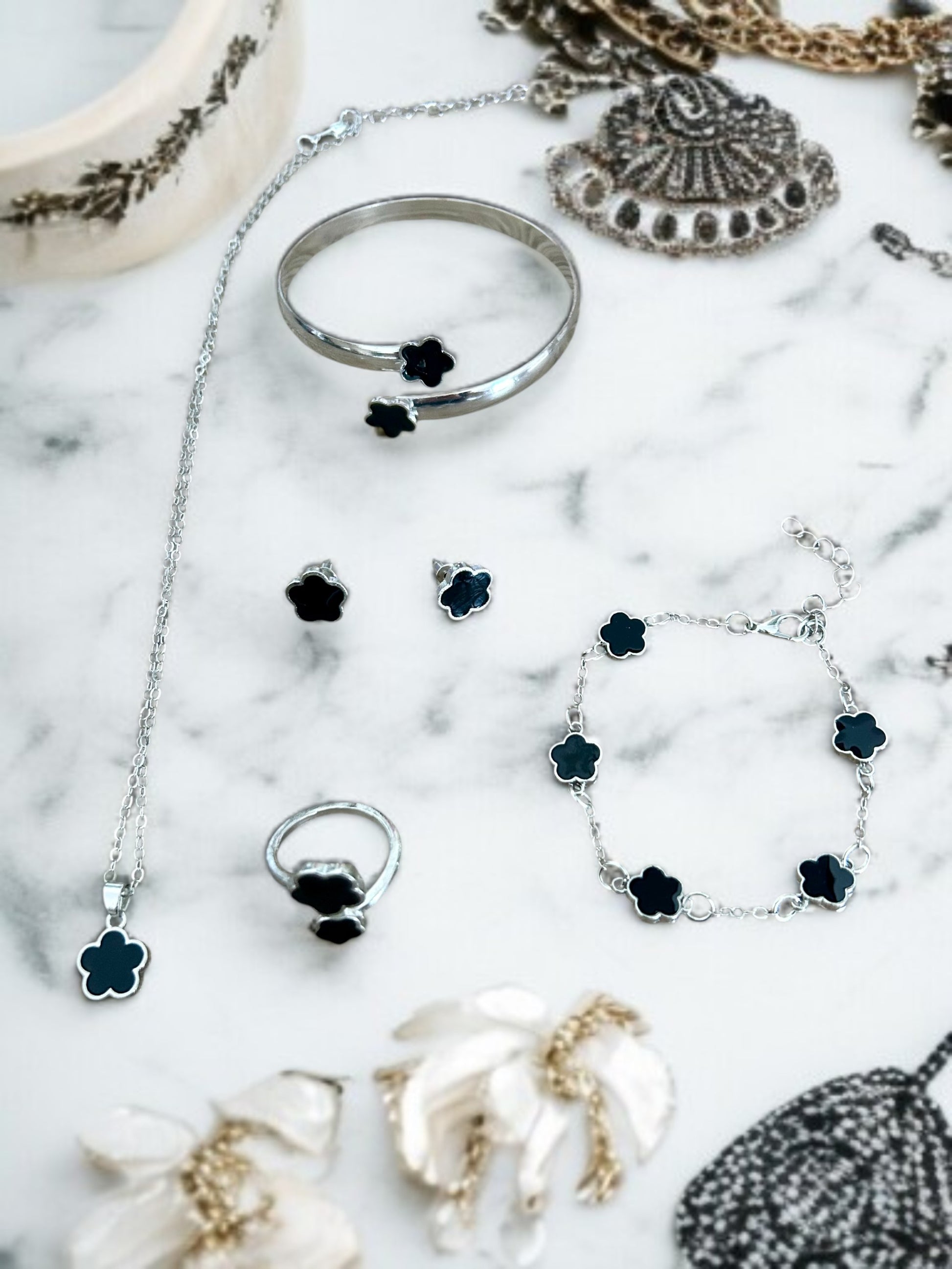 Parure comprenant 4 bijoux argentés noir/blanc ou vert fantaisie motif fleurs / trèfles 5 feuilles comprenant :