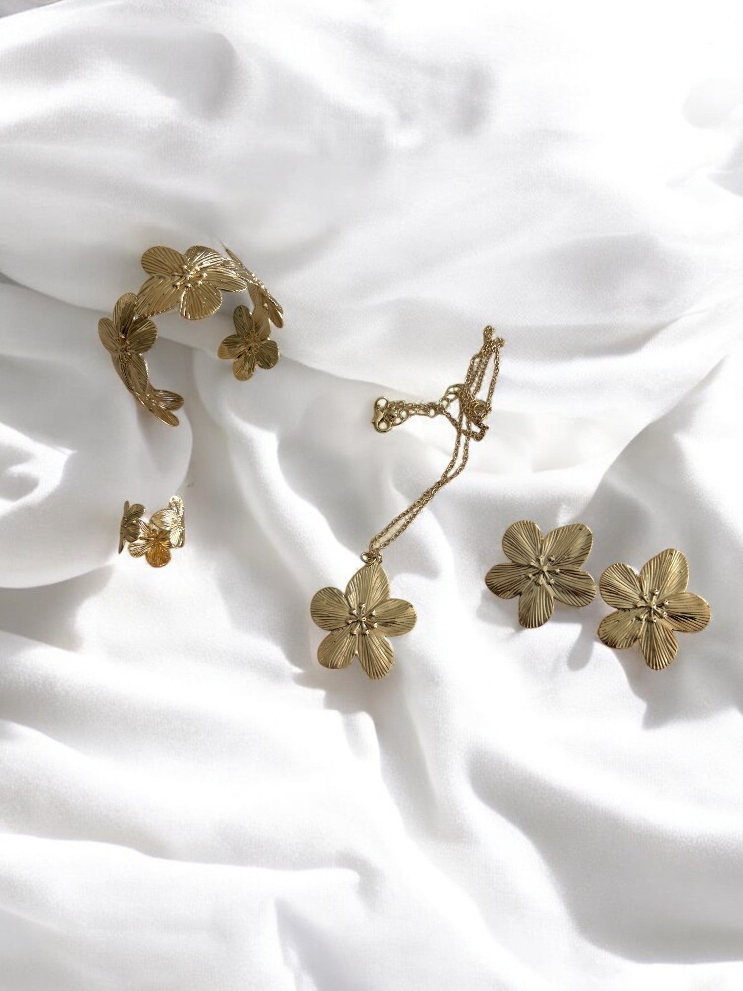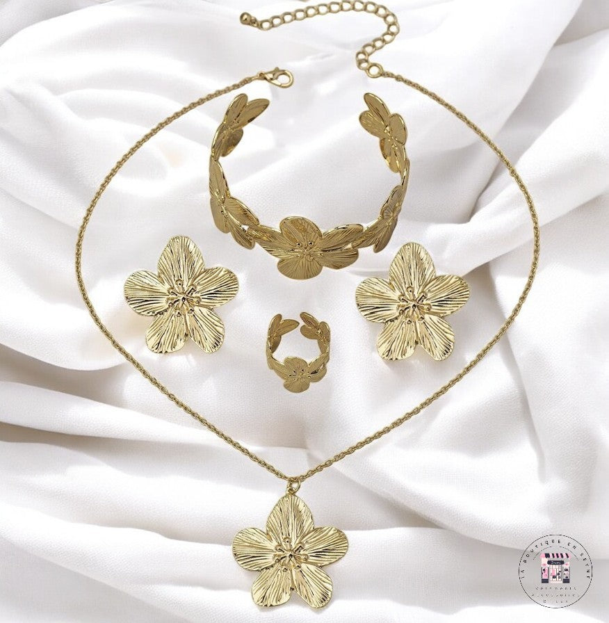 Parure comprenant 4 bijoux dorés ou argentés motif fleurs